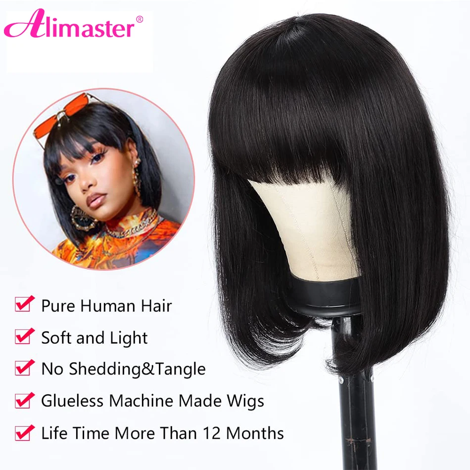 Прямой парик Боб с челкой, прямые человеческие волосы, парики для женщин, человеческие волосы, без кружева, парики машинной работы, парик с бахромой