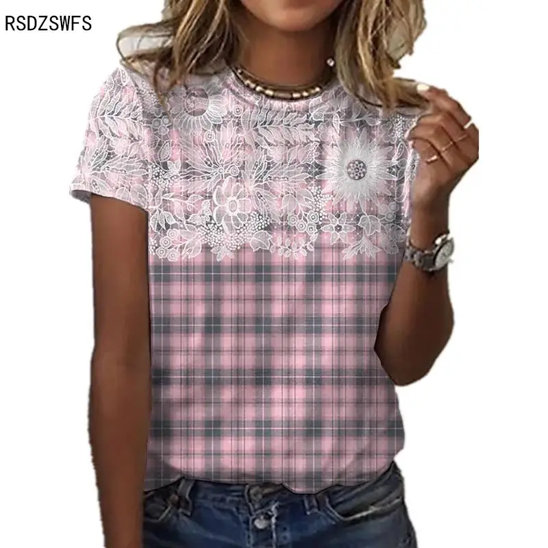 Женская клетчатая футболка в полоску, Повседневная Свободная футболка с коротким рукавом, 2021