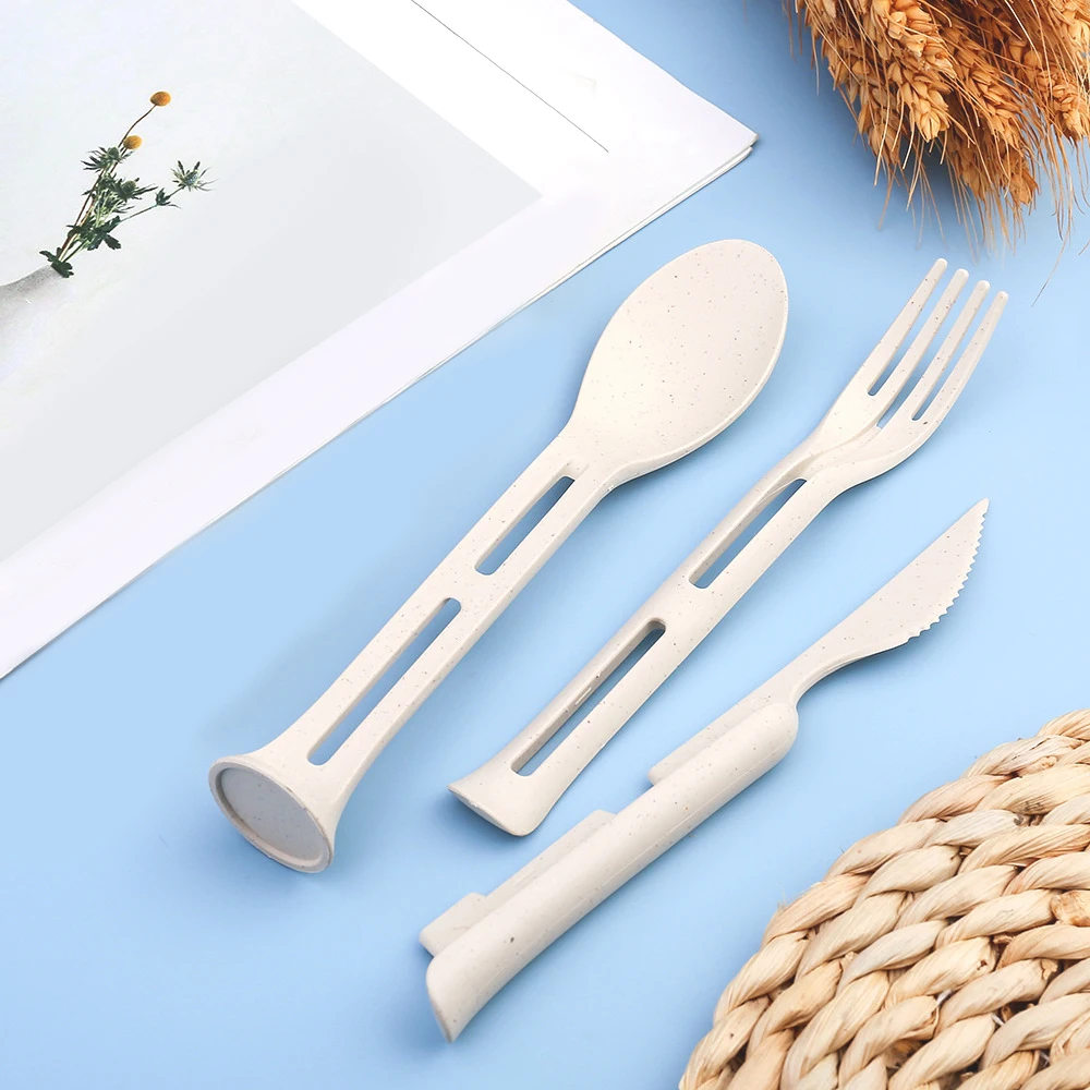 Детский портативный набор ножей и вилок из пшеничной соломы, портативная посуда «Три в одном».