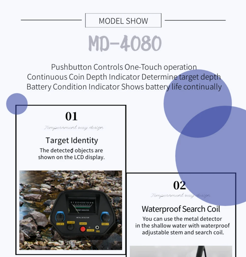 Этот металлоискатель MD4080 может охотиться на монеты, реликвии, ювелирные изделия, золото, серебро и любые металлы. Этот детектор обладает высокой чувствительностью