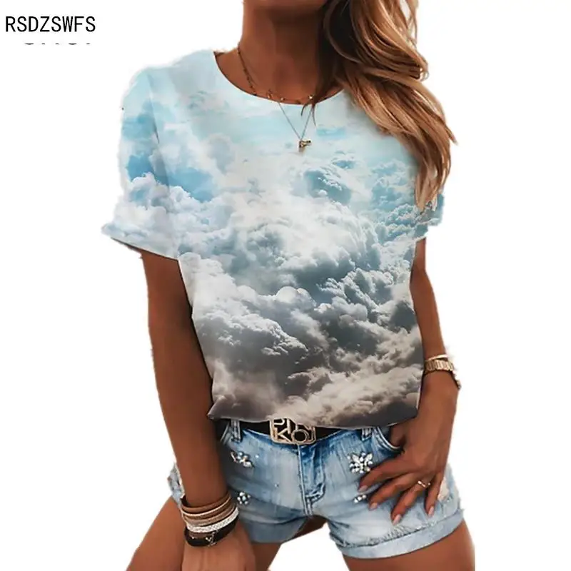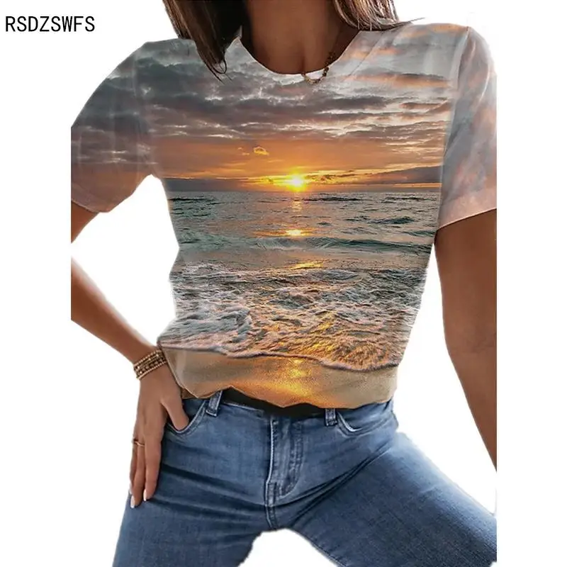 Женская летняя футболка с 3D-принтом, короткий повседневный летний топ с рисунком Морского Пейзажа, с круглым вырезом