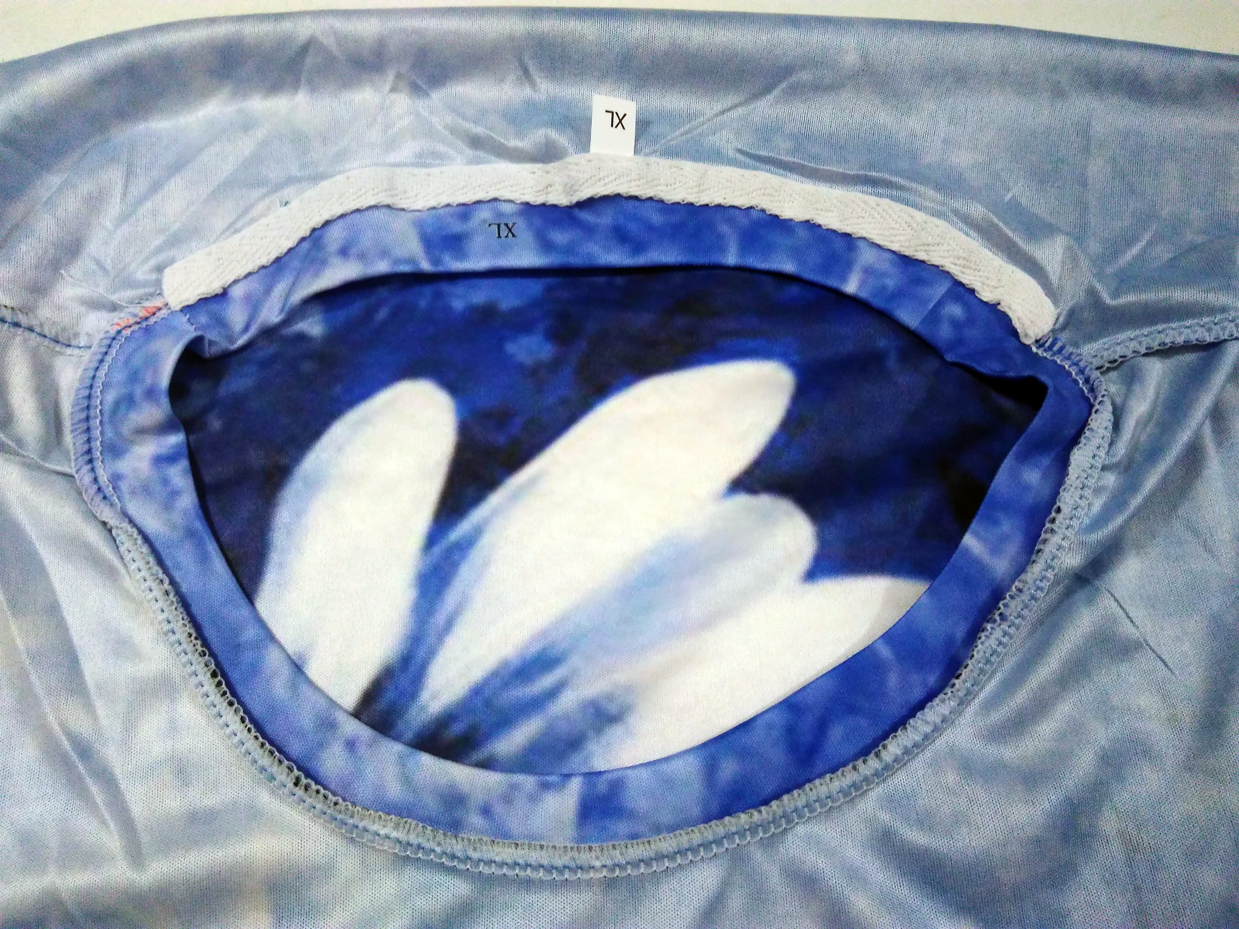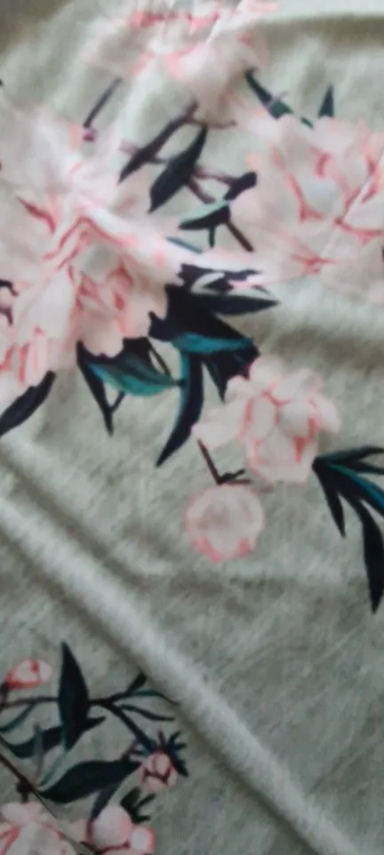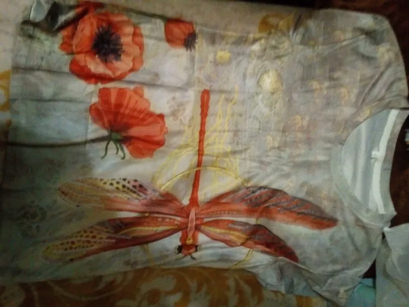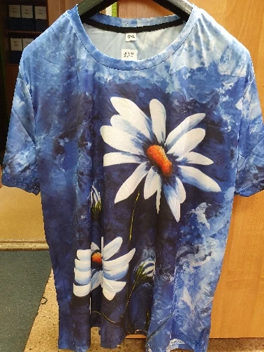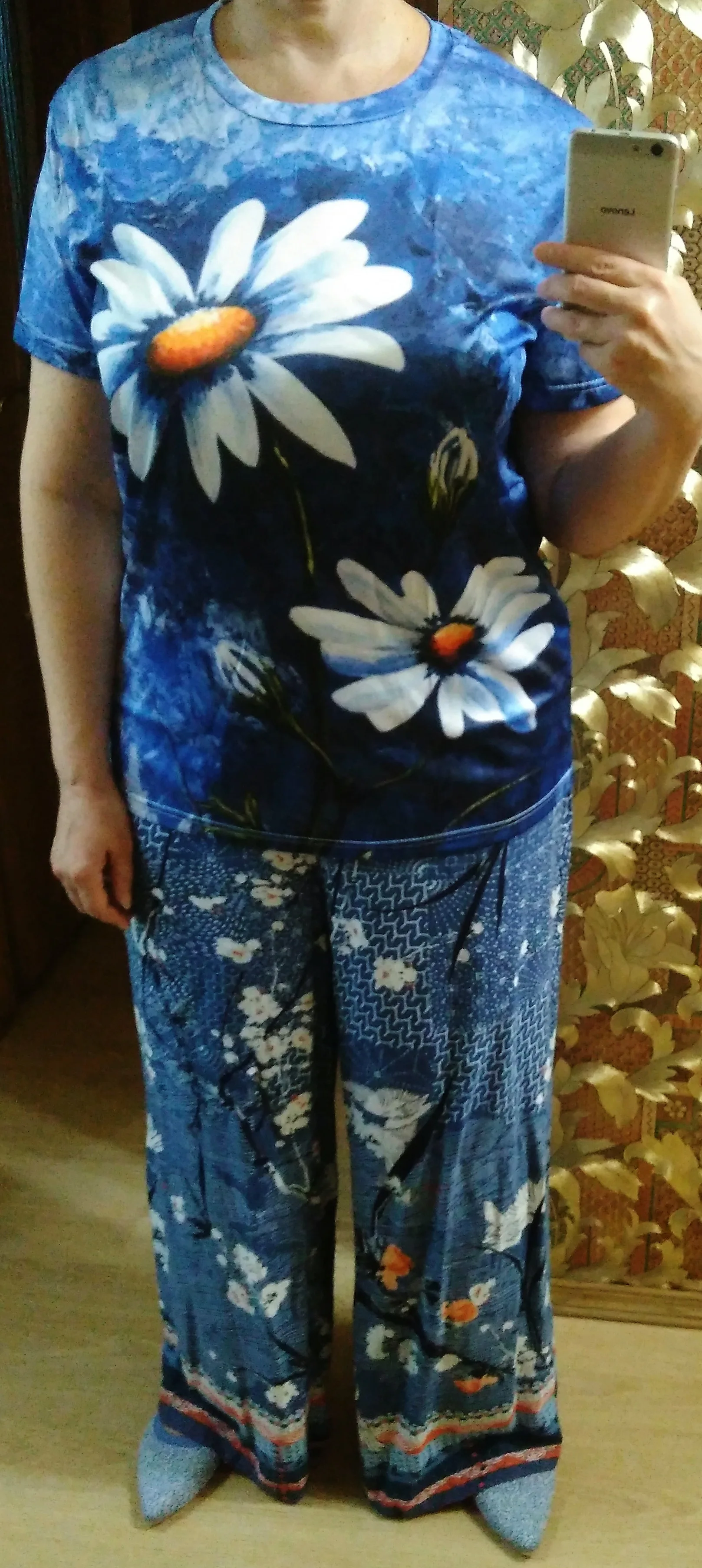 Футболка синтетика приятная к телу. Доставка чуть меньше месяца, заказала 03.03, пришла 28.03 в Екатеринбург. На фото ощущение что есть стразы или паетки на цветке, в реальности их нет , только рисунок. В жизни ношу размер M-L, заказала XL, самое то по размеру. Продавца рекомендую.