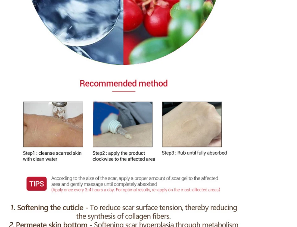 Советы:В соответствии с размером рубца, нанесите необходимое количество рубцового геля на поврежденную область и аккуратно массируйте до полного впитывания