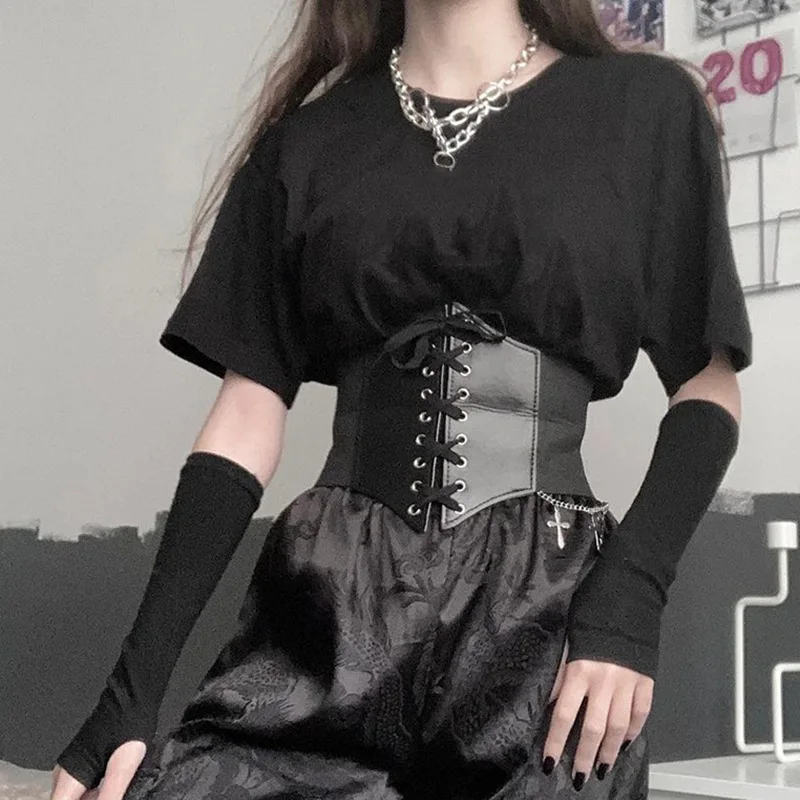 Готический Темный кружевной женский пояс-корсет широкий из искусственной кожи пояс женский модный пояс для похудения регулируемое платье Украшенный Пояс укороченный топ