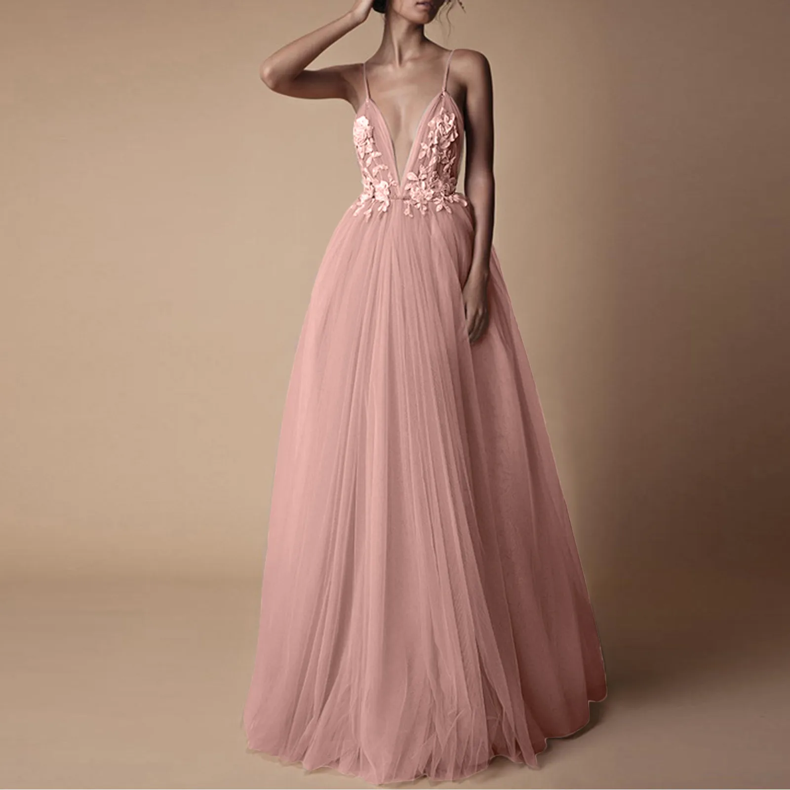 Элегантное сексуальное кружевное Сетчатое вечернее платье с глубоким V-образным вырезом, женское платье без рукавов с открытой спиной для свадьбы, платье подружки невесты, длинное розовое платье на бретелях