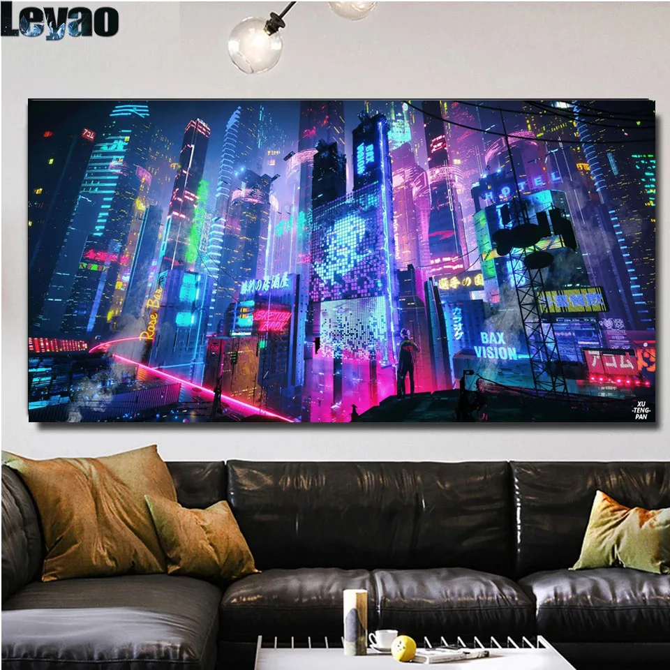 Алмазная живопись, полный квадратный город, ночь, киберпанк, город, неоновый футуристический пейзаж, домашний декор, подарок, картина Стразы ручной работы