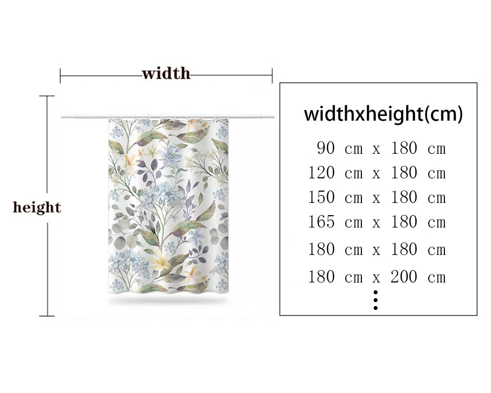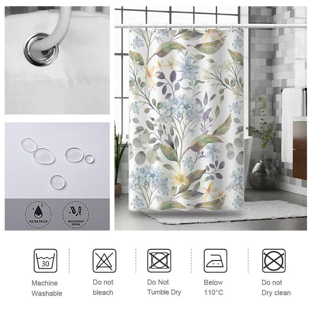 Узор: цветы и листья Материал штор: полиэстер Характеристики: водонепроницаемый, мягкий и прочный Использование: украшение для дома и отеля Посылка включает в себя: 1 занавеска для душа + 12 пластиковых крючков Очень мягкая ткань высокой плотности, удобная, Экологичная, хорошая вентиляция.