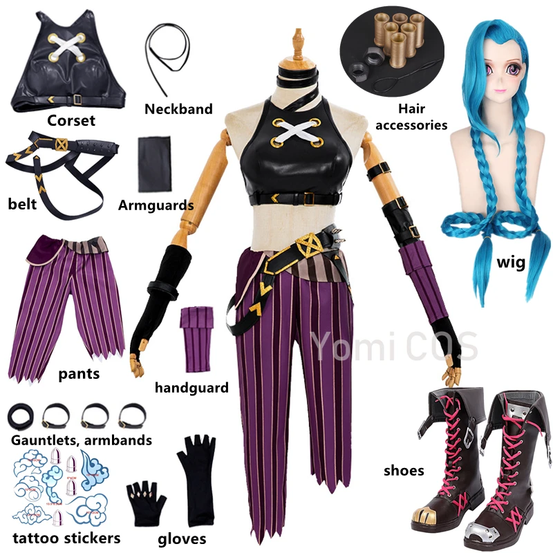 Костюм для косплея Jinx Лига Легенд, аниме искусственная длинная тату-наклейка с париком, ботинки, униформа LOL Jinx