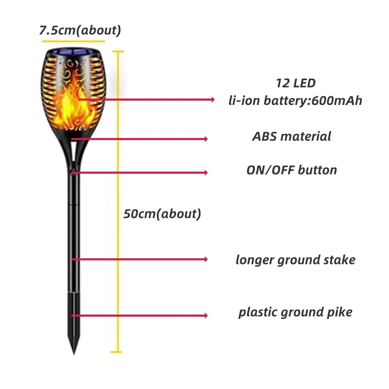 Технические характеристикиНазвание продукта: 12 Светодиодный светильник на солнечной батарееМатериал: АБС-пластикРазмеры: около 50*7,5 смРежим питания: солнечная энергияКоличество: 1/2/4/6 шт.Характеристики: водонепроницаемый, прочный, светильник мигает как пламя Как использовать:1. Установите лампу на открытом воздухе или в солнечном месте. При первом использовании, пожалуйста, нажмите кнопку включения лампы.2. Автоматическая зарядка в течение дня, лампа не будет светиться в течение дня, но светильник автоматически включается ночью.3. В случае облачных или дождливых дней лампа не может поглощать достаточное количество солнечного света, что влияет на яркость и время работы в ночное время. Если вы столкнулись с непрерывным дождем, рекомендуется временно выключить выключатель, подождать солнечный день, а затем включить переключатель для зарядки, что может продлить срок службы батареи.