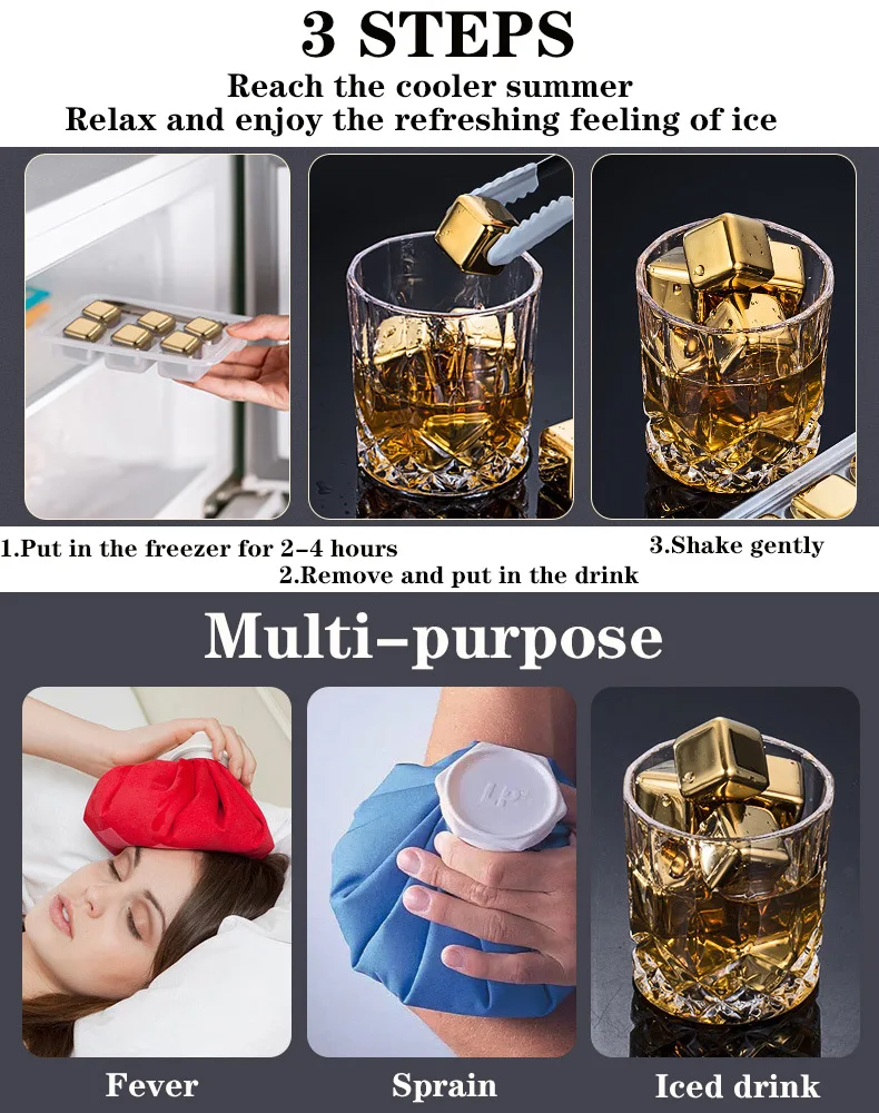 Особенности-Многоразовые и замораживающие быстрее. Безвкусный и не реактивный. Ваши напитки сохранят 100% своих оригинальных вкусов.-Камни для виски содержат очищенную воду и питьевой спирт, безопасны и надежны.-Эти камни не царапают вашу любимую стеклянную посуду или не повредят губы.* Как использовать камень виски?1. Пожалуйста, Вымойте кубики льда в первый раз.2. Храните их в морозильной камере в течение 1-2 часов и более.3. Три-четыре замороженных кубика лучше использовать на один напиток для максимального удовольствия4. После использования, Вымойте стальные кубики и храните их в замораживанииТехнические характеристикиМатериал: нержавеющая сталь 304Размер: 26 ммКоличество: как показаноПроцесс: зеркальная полировкаНазначение: ледяной напиток, кофе, дождь, ледяной компресс и т. Д.