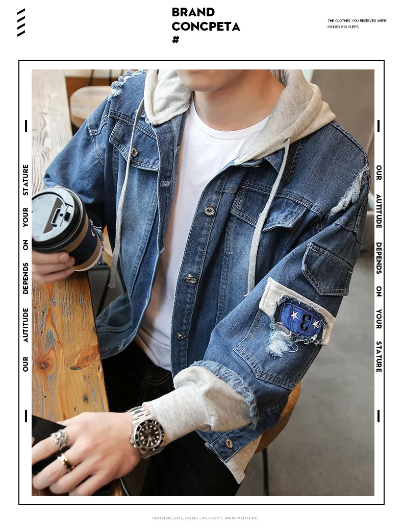 Уличные мужские демисезонные джинсовые куртки 2022, повседневные свободные джинсовые куртки с капюшоном, мужские бриджи, пальто, корейская уличная одежда