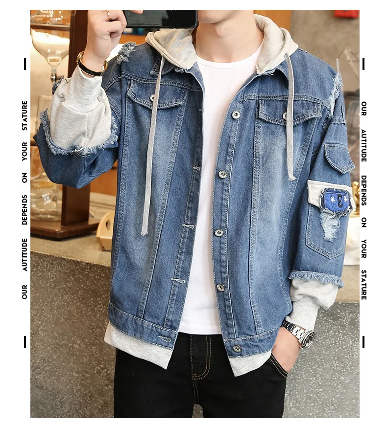 Джинсовая куртка мужская с капюшоном, куртка из денима в стиле хип-...