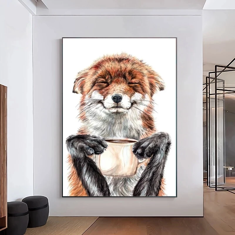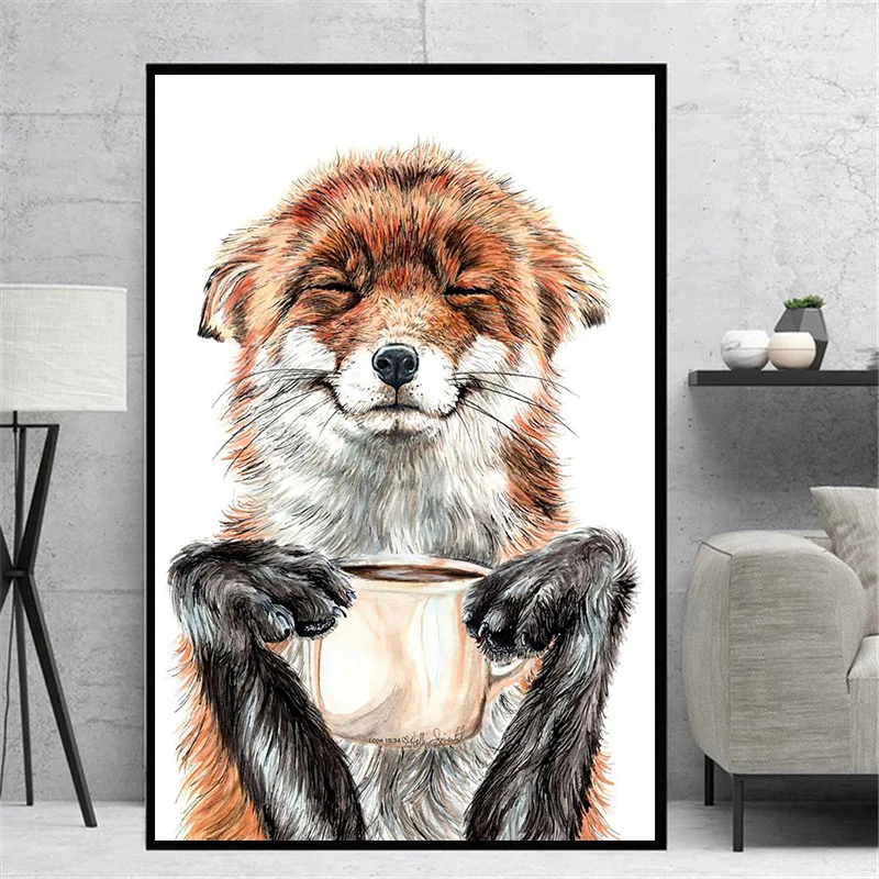 Современная мультяшная абстрактная животная лиса питьевой кофе Картина на холсте Печать и плакат Настенная картина для гостиной домашний декор