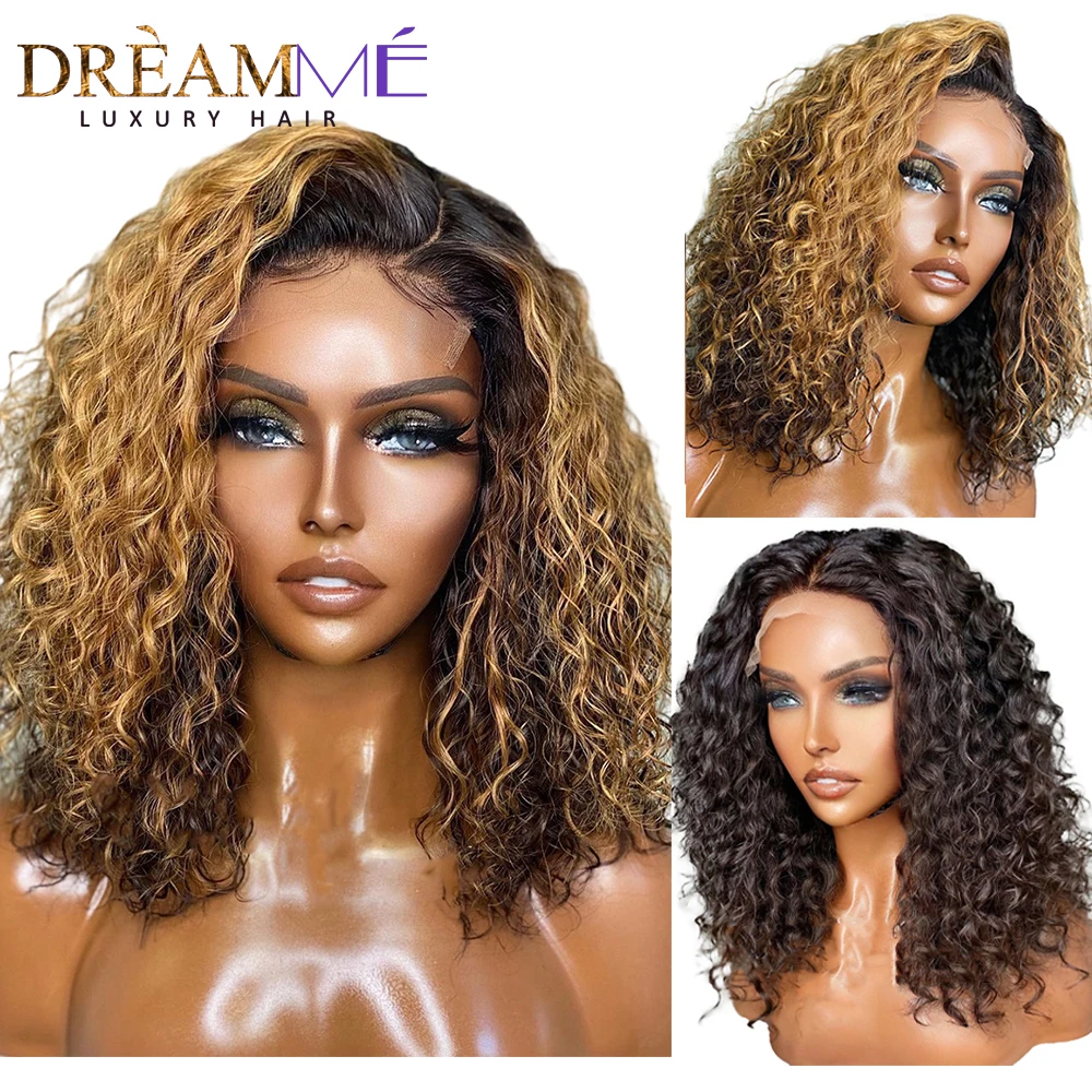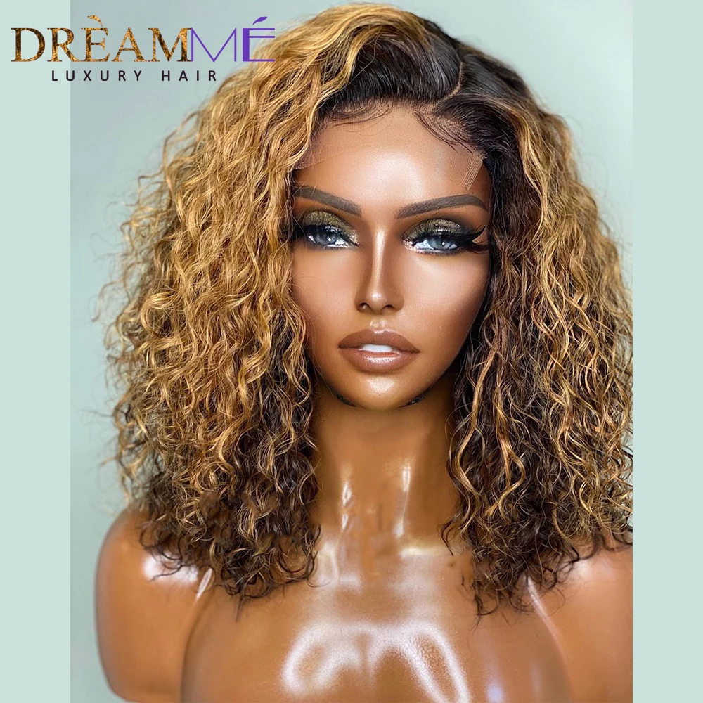 Короткий вьющийся медовый блонд Боб вьющиеся человеческие волосы парик 4x4 парик на сетке с глубокой волной хайлайтер фронтальный парик для женщин предварительно выщипанный