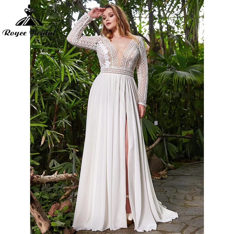 Женское свадебное платье с длинным рукавом, кружевное шифоновое богемное платье с разрезом по бокам