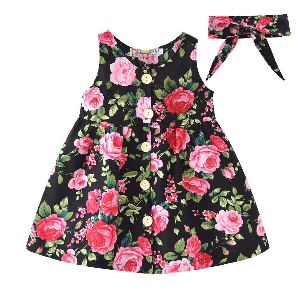 Наряд для маленьких девочек, платье без рукавов, повязка на голову с цветочным принтом и открытой спиной, Милый Летний сарафан, вечерние платья для девочек 1-5 лет