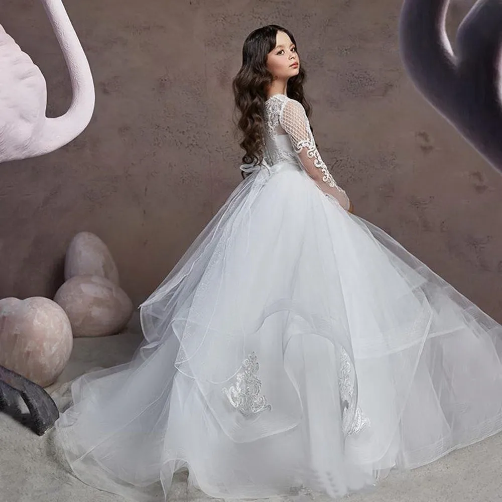 Романтические недорогие платья с открытыми плечами для девочек с цветами для свадьбы невесты иллюзия с длинными кружевными рукавами тюль цвета шампанского дизайнерские для детей