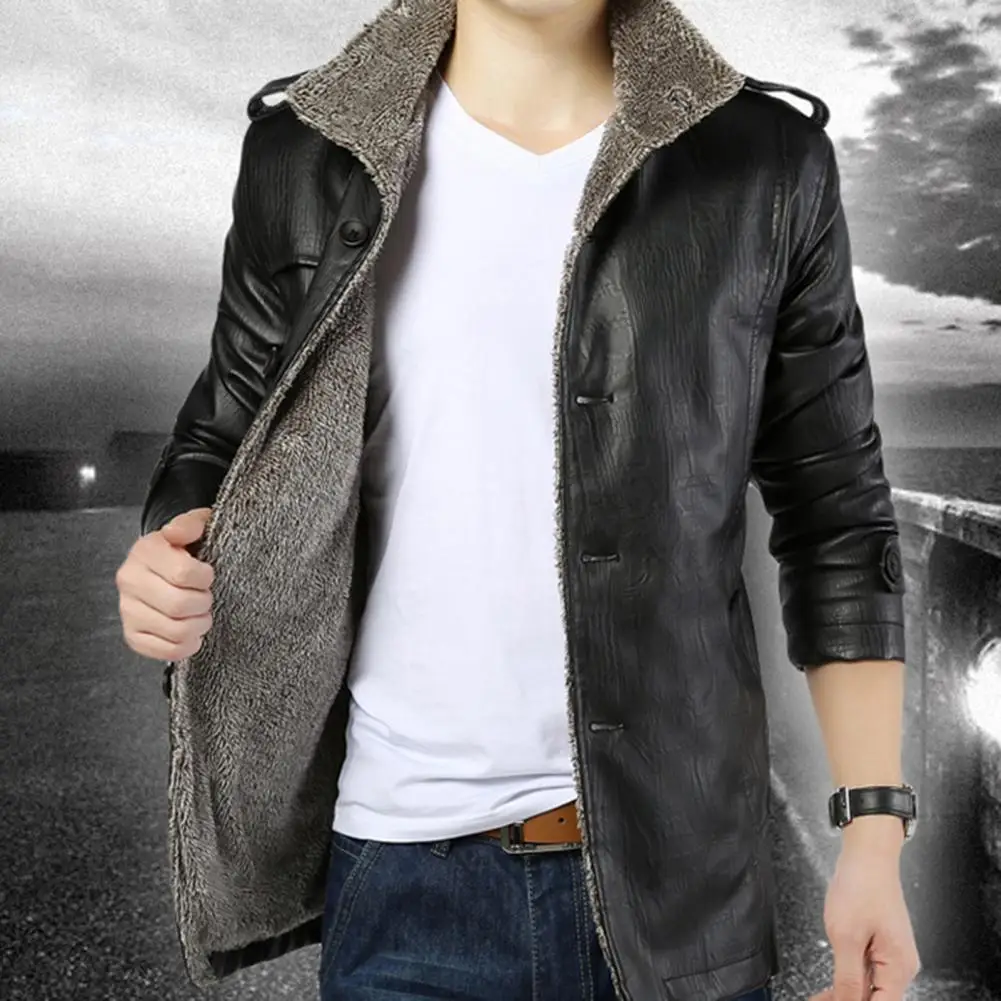 Зимняя теплая куртка из искусственной кожи, мужское однотонное пальто с длинным рукавом и воротником-стойкой, плотная приталенная куртка, тренчкот, куртка, верхняя одежда
