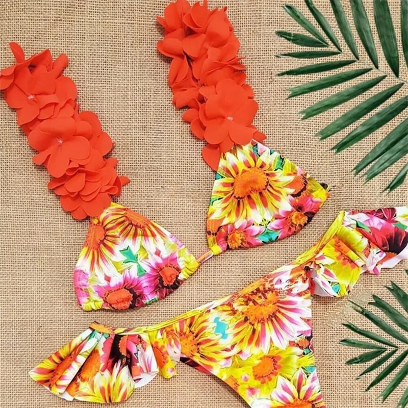 Бикини 2021, сексуальный цветочный принт, оборки, лепестки, бретельки, купальник, женский бикини, набор, купальный костюм, Пляжное бикини, женский купальник