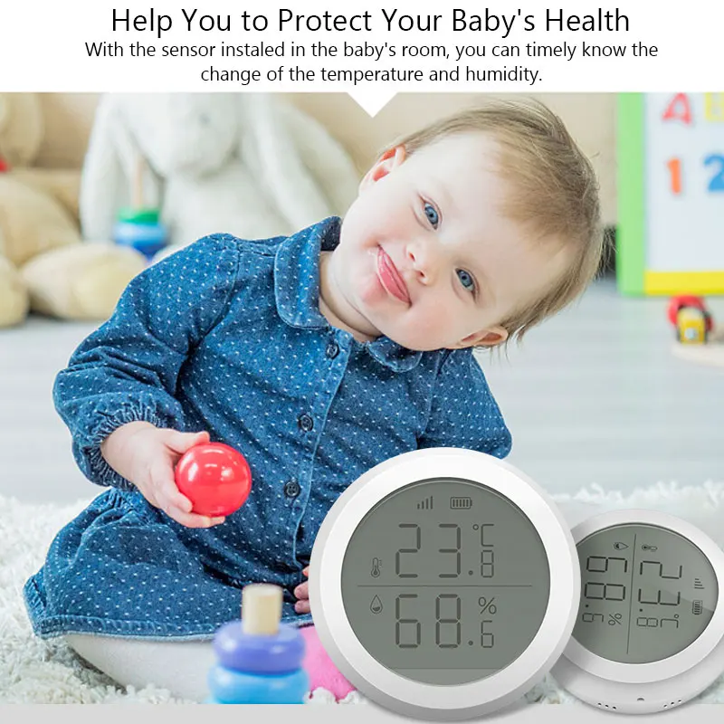 С датчиком, установленным в комнате ребенка, вы можете своевременно узнать изменение температуры и влажности.
