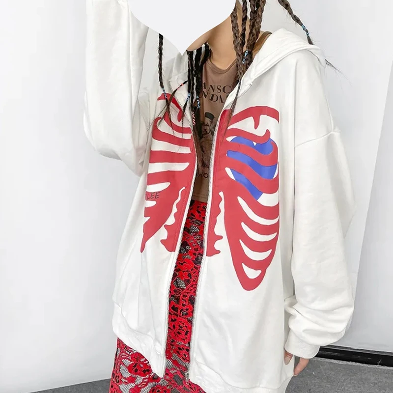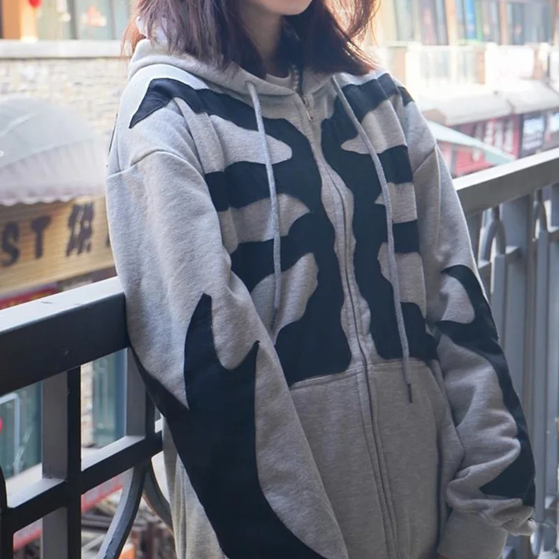 Толстовка Y2K в стиле Харадзюку со скелетом на молнии, Мужская толс...