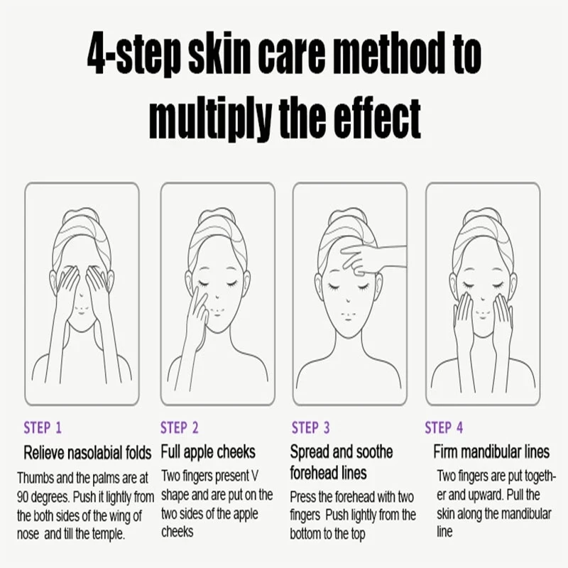▶1. Снимает носогубные складкиПальцы и ладони на 90 градусов. Слегка прижмите его с обеих сторон носа и до виска.▶2. Полные яблочные щекиДва пальца имеют v-образную форму и наносят на две стороны яблока.▶3. Разложить и успокоить линии лбаПрижмите лоб двумя пальцами, слегка нажмите снизу вверх▶4. Прочные нижние частиДва пальца помещаются вместе и вверх. Вытяните кожу вдоль нижней части