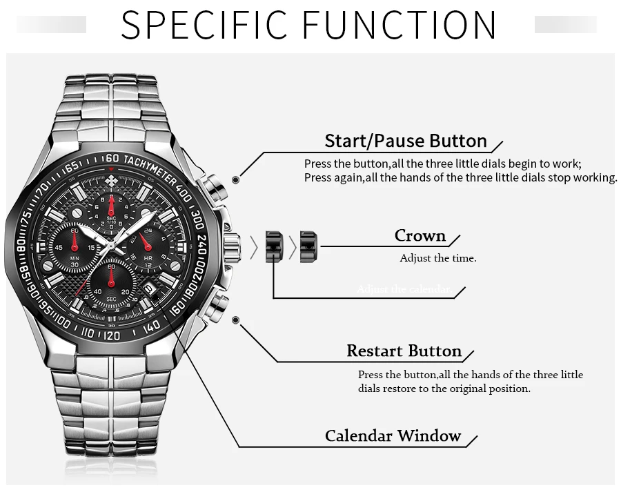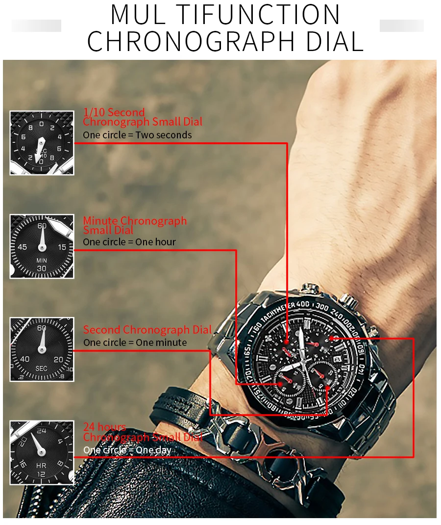 Мужские кварцевые часы с хронографом, из нержавеющей стали