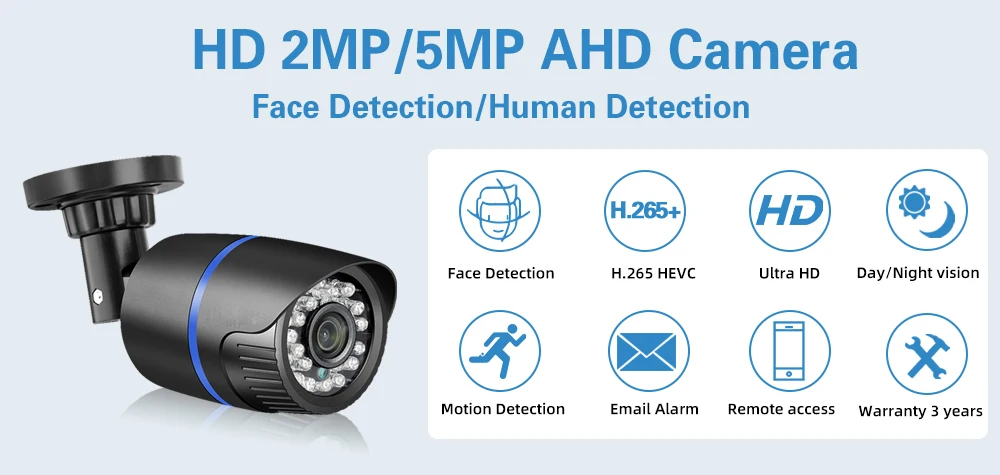 1, Ультра HD 5MP/2MP дисплей высокой четкости;2. Ультра HD 5MP/2MP AHD камера, АБС-пластик, IP66 водонепроницаемый, подходит для внутреннего и наружного использования; Пылезащитная, надежная Домашняя безопасность;3. Улучшенное H.265 Сжатие видео, подключи и работай, простота установки;4. Поддержка распознавания лица, записи лица, воспроизведения лица, обеспечивает ультра высокое разрешение видео наблюдения, обеспечивая максимальную детализацию и четкость доступны;5. Поддержка ночного видения Ultra HD, расстояние передачи составляет 500 метров;6. Поддержка IR-CUT переключателя двойного фильтра, днем и ночью для достижения мониторинга, цвет не является частичным искажением цвета;7. Поддержка обнаружения движения, оповещения по электронной почте, воспроизведения видео;8. Поддержка Android,Iphone,Ipad, ПК, P2P просмотра;9, удаленный доступ в любом месте, в любое время;