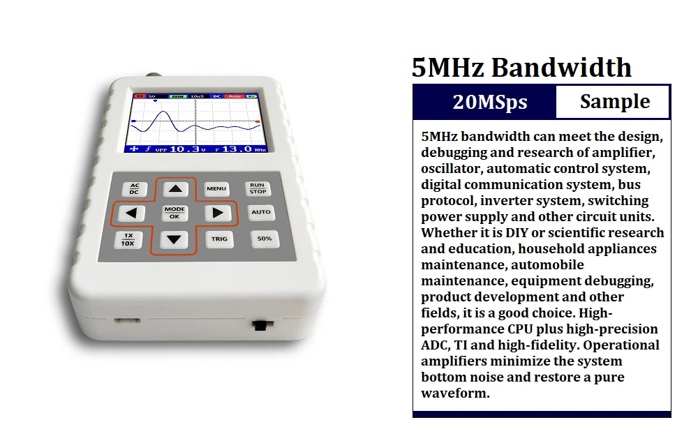 DSO PRO-это полнофункциональный, высокопроизводительный и экономичный Ручной осциллограф для отрасли технического обслуживания и R & amp; D. Осциллограф имеет частоту дискретизации в реальном времени до 20 мс/с и аналоговую пропускную способность 5 МГц. С полной функцией запуска (одиночный, нормальный, автоматический), можно свободно использовать как аналоговый сигнал, так и аперитив цифрового сигнала. Режим сканирования с большой базой времени может контролировать медленные изменения уровня. Оснащен высокой эффективностью одной кнопкой авто, измеренная форма сигнала может отображаться без сложной регулировки. Дисплей в Высокое разрешение ЖК-дисплей экран оснащен 2,4 дюймов 320*240 разрешение. Чрезвычайно удобная и быстрая функция хранения сигналов, встроенная память объемом 16 Мб, Максимальная память 500 изображений формы волны. Мощный файловый менеджер waveform, поддержка просмотра эскизов, просмотра, просмотра деталей, переворачивания, удаления и других функций. Встроенный перезаряжаемый литиевый аккумулятор емкостью 1200 мАч может непрерывно заряжаться в течение 3 часов одновременно. Дневной режим и ночной режим могут быть изменены в соответствии с их собственными предпочтениями.