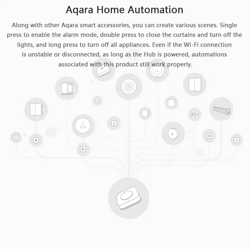 Наряду с другими умными аксессуарами Aqara вы можете создавать различные сцены. Одно нажатие для включения режима будильника, двойное нажатие, чтобы закрыть шторы и выключить свет, и длительное нажатие, чтобы выключить все приборы. Даже если соединение Wi-Fi нестабильно или отключено, до тех пор, пока концентратор Работает, автоматизация, связанная с этим продуктом, все еще работает должным образом.