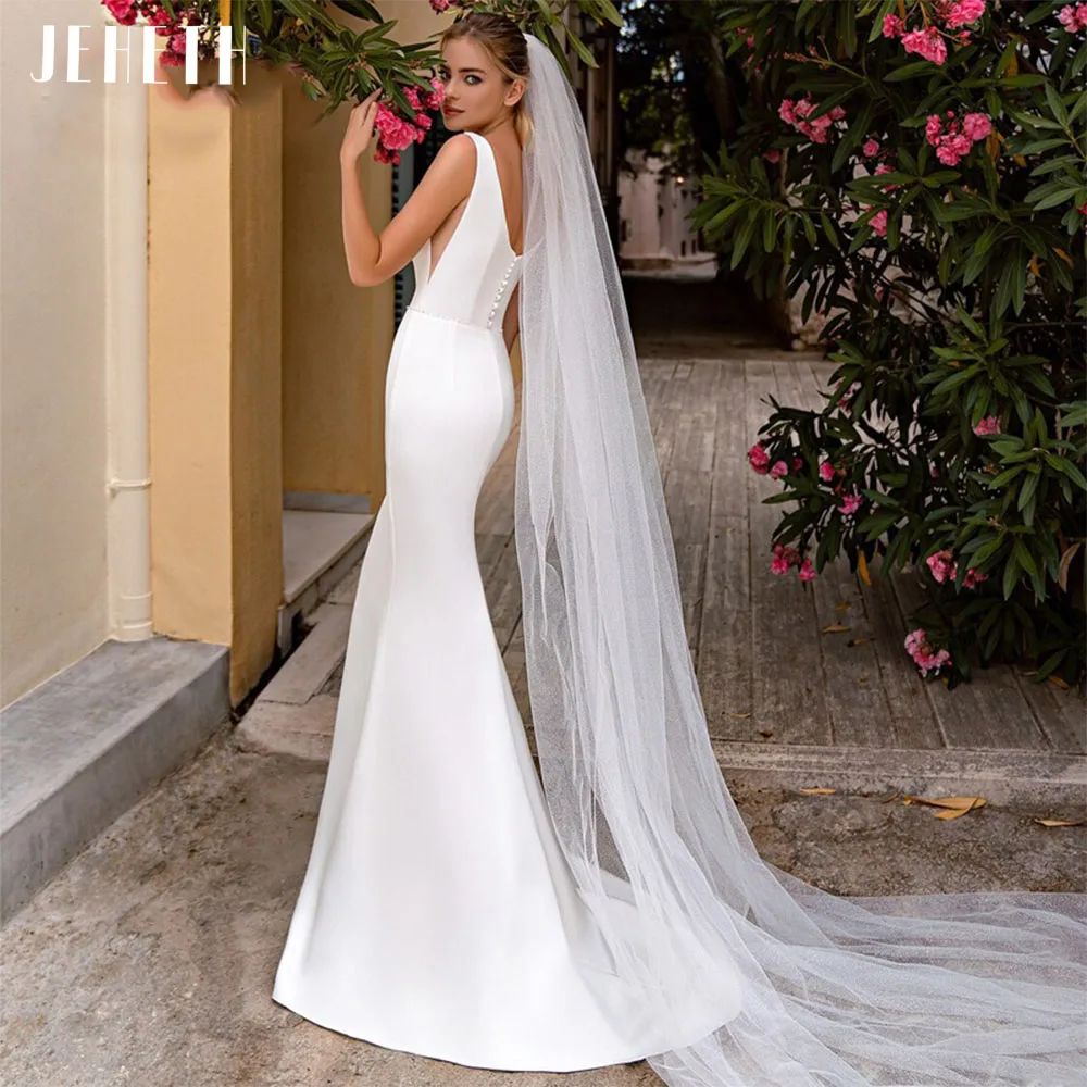 Женское атласное свадебное платье JEHETH, белое платье с V-образным вырезом и юбкой-годе, простое платье невесты без рукавов с открытой спиной, 2022