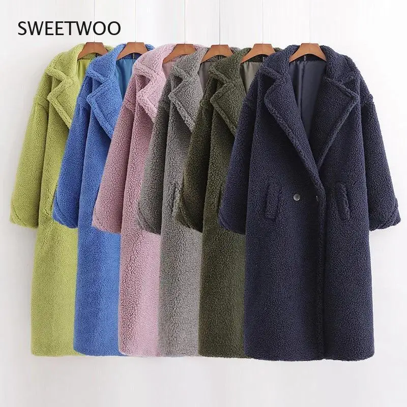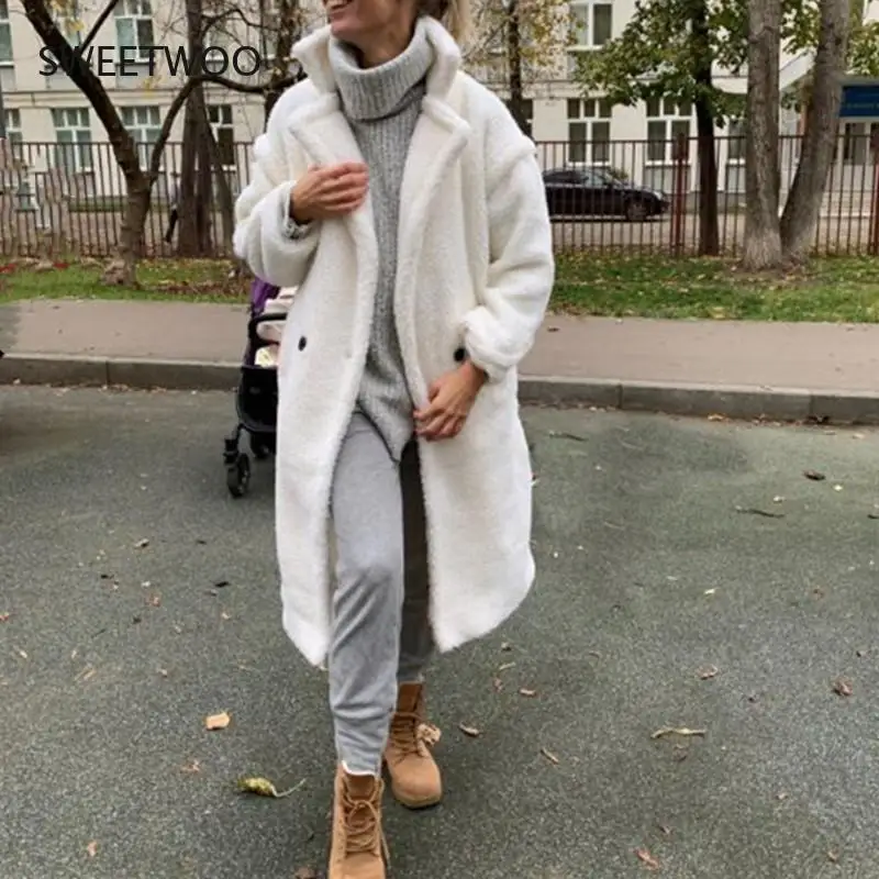 Зимнее длинное пушистое пальто из искусственного меха с отложным воротником и ворсом, Женская дубленка цвета слоновой кости, пушистые длинные куртки, теплая верхняя одежда 2022