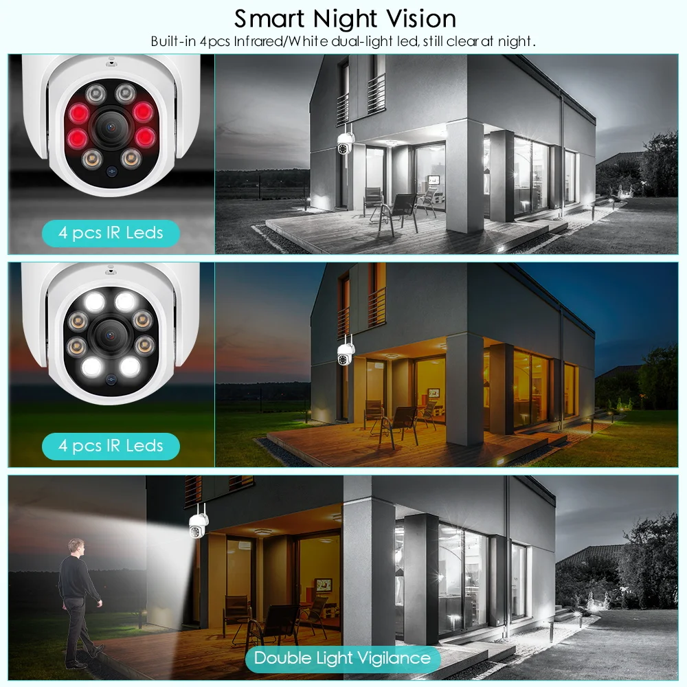 Эта камера имеет встроенный 4 шт. инфракрасный и 4 шт. белые светодиоды, который может быть полностью контролирован на мобильный телефон APP и может переключаться между нормальным инфракрасным/белым светильник/двойной светильник режима бдительности просто и быстро.
