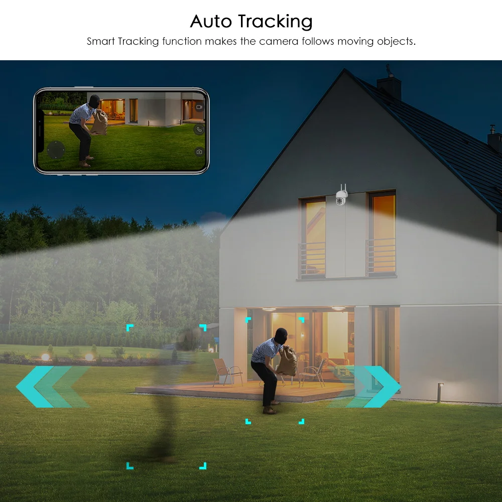 После блокировки цели камера автоматически регулирует вращение панорамирования, отслеживая движущиеся объекты, автомобили, домашних животных, человека и уведомления push-оповещений на ваш смартфон.