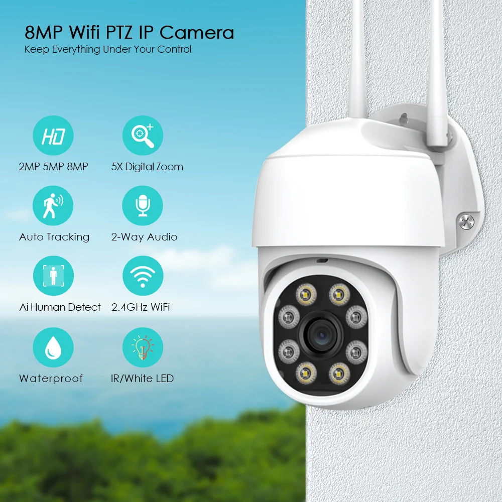Эта PTZ WiFi камера имеет прочный корпус и корпус, Уровень водонепроницаемости IP66 делает ее идеальной для наружного наблюдения. Водонепроницаемость, защита от солнца и защита от пыли. Подходит для любой среды.