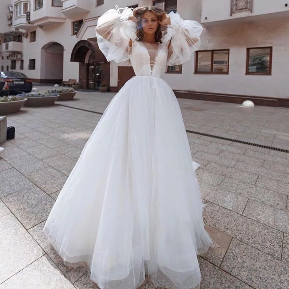 Классические свадебные платья из тюля со съемным пышным длинным рукавом трапециевидной формы с овальным вырезом