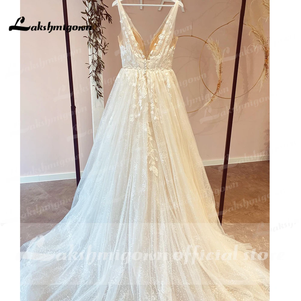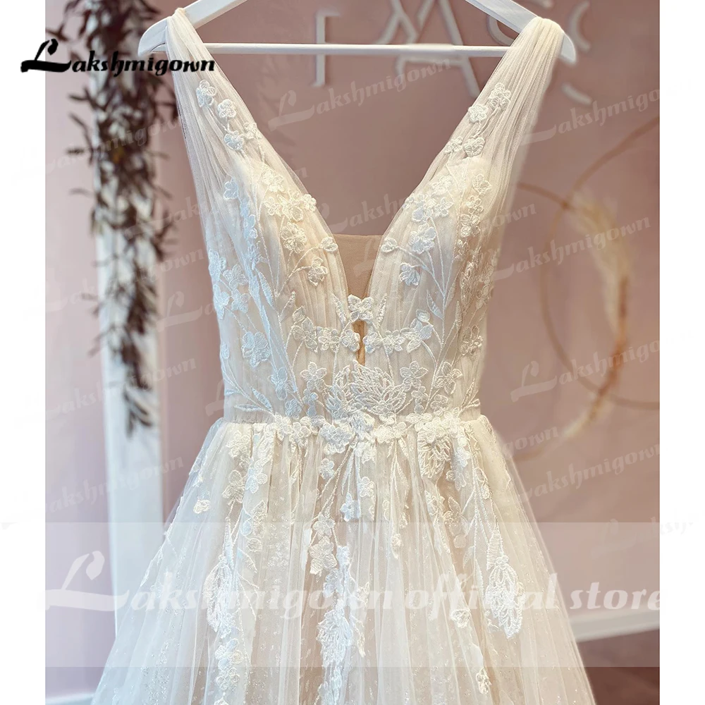 Lakshmigown свадебное платье цвета шампанского с V-образным вырезом и кружевной аппликацией 2022 с блестящим тюлем, садовое платье трапециевидной формы