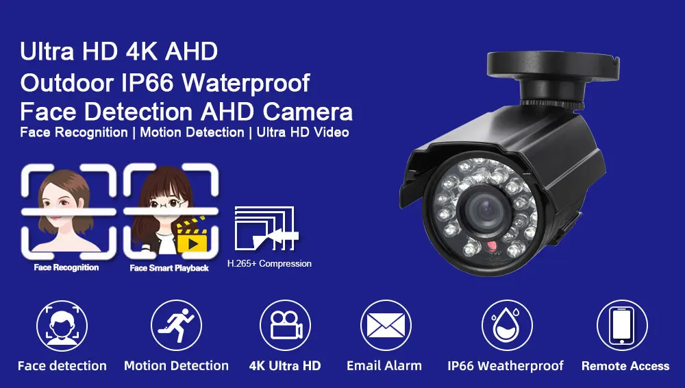 1, Ультра HD 4K дисплей высокой четкости;2. Ультра HD 8MP AHD камера, металлический материал, IP66 водонепроницаемый, подходит для внутреннего и наружного использования; Пыленепроницаемый, надежный для домашней безопасности;3. Улучшенное H.265 Сжатие видео, подключи и работай, простота установки;4. Поддержка распознавания лица, записи лица, воспроизведения лица, обеспечивает ультра высокое разрешение видео наблюдения, обеспечивая максимальную детализацию и четкость доступны;5. Поддержка ночного видения Ultra HD, расстояние передачи составляет 500 метров;6. Поддержка IR-CUT переключателя двойного фильтра, днем и ночью для достижения мониторинга, цвет не является частичным искажением цвета;7. Поддержка обнаружения движения, оповещения по электронной почте, воспроизведения видео;8. Поддержка Android,Iphone,Ipad, ПК, P2P просмотра;9, удаленный доступ в любом месте, в любое время;