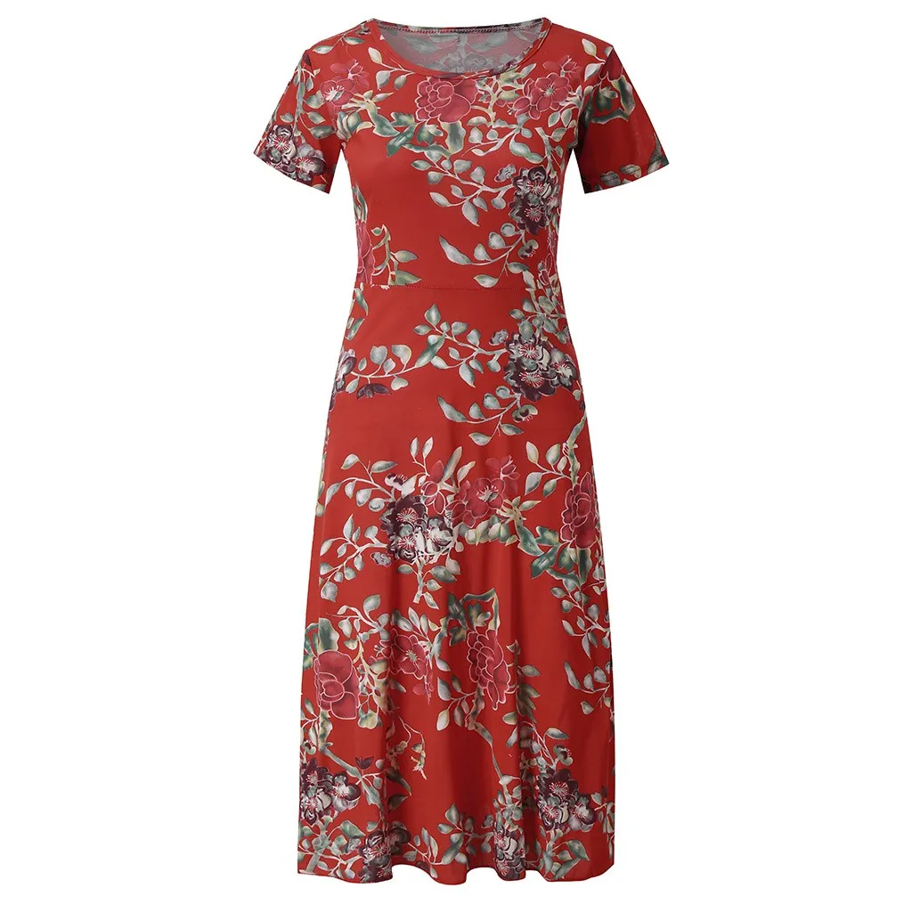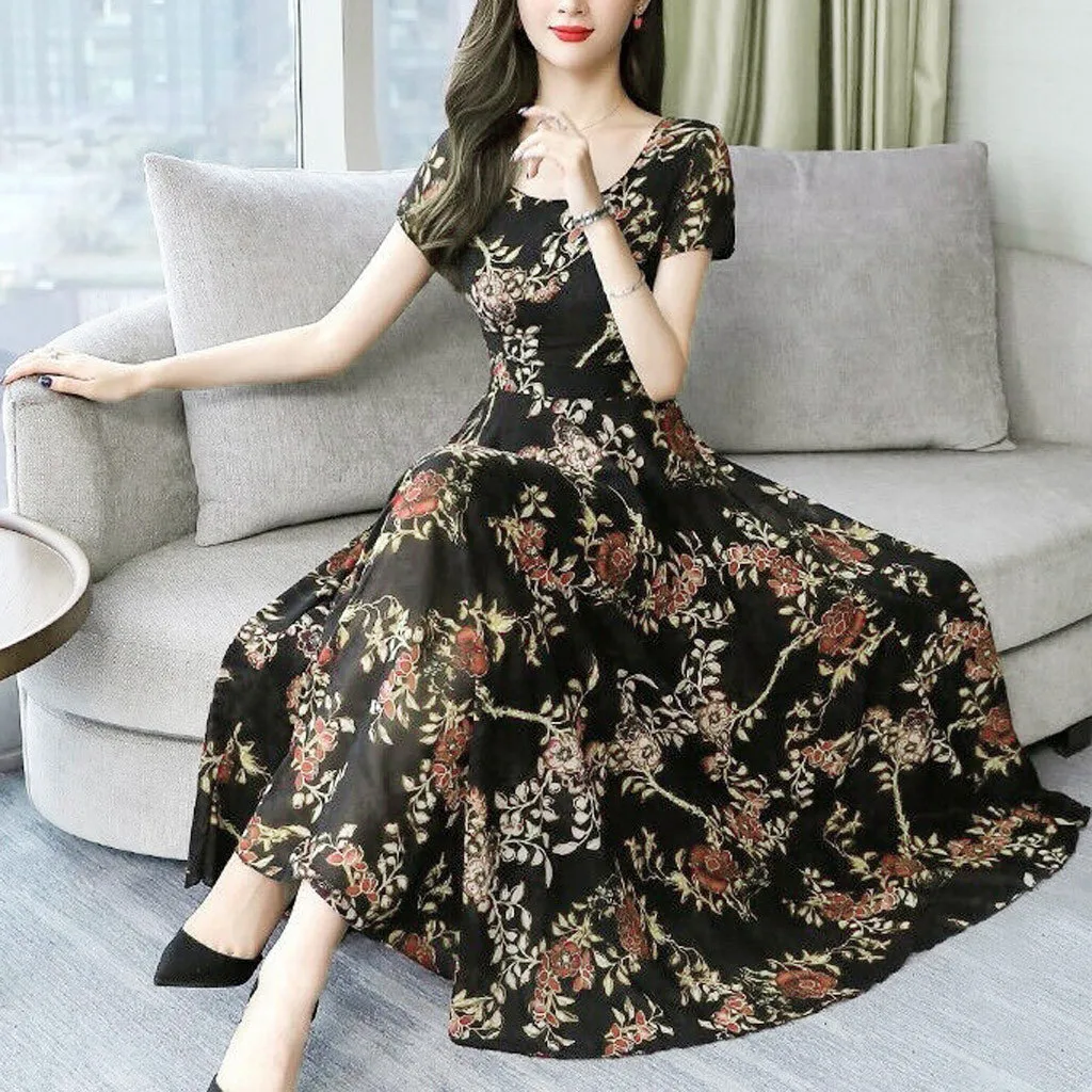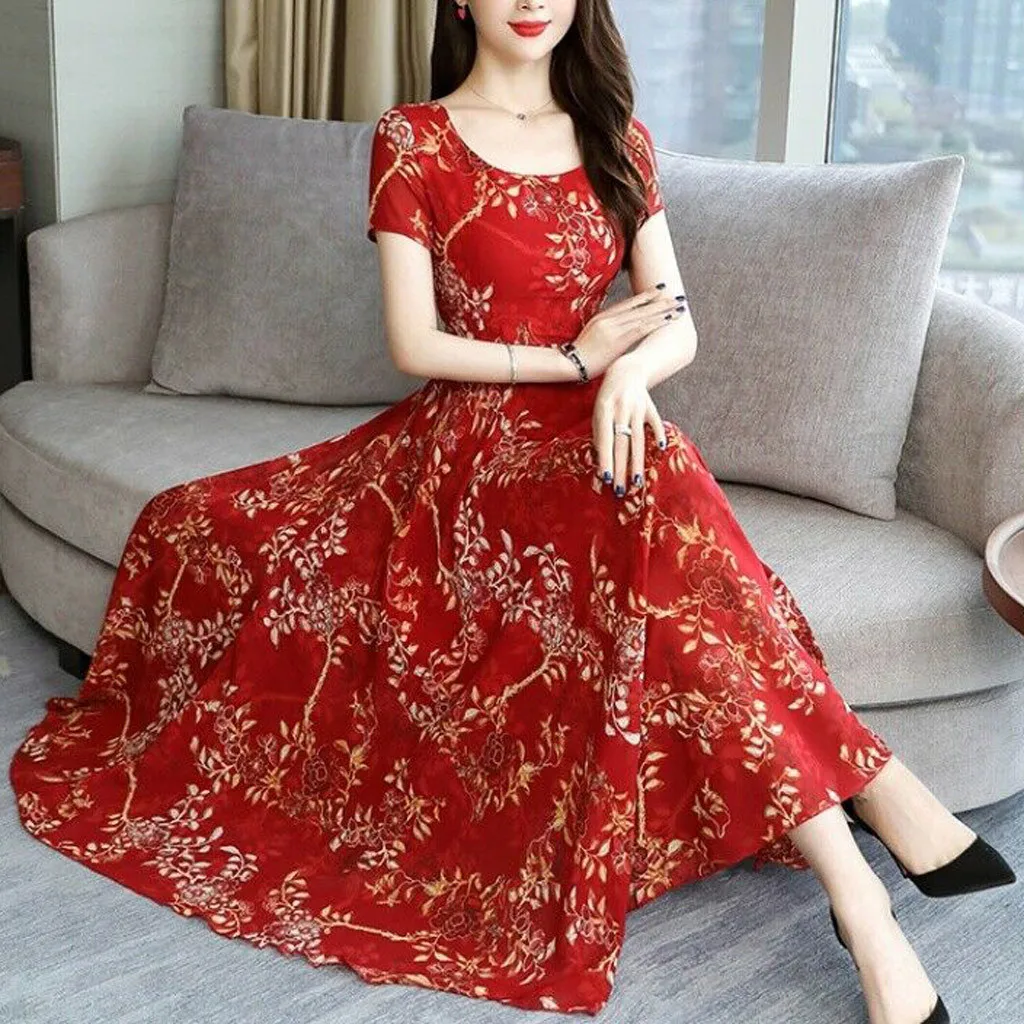 Женское модное летнее длинное платье с круглым вырезом и коротким рукавом