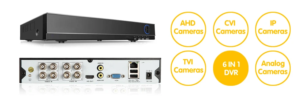 Вы можете свободно наслаждаться шестью режимами подключения с помощью этого многофункционального цифрового видеорегистратора.AHD (аналог высокой четкости)-это новая передовая технология домашней безопасности с 6 режимами записи. Для вашего варианта: AHD /CVBS / TVI / CVI /XVI / IP. Вы можете получить видео высокого качества в каждом режиме.