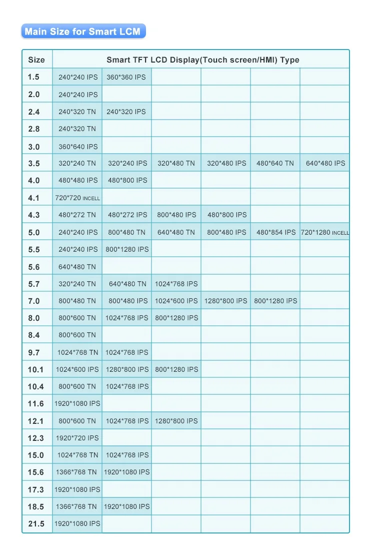 Размер указан в диапазоне от 1,5 дюймов до 21,5 Дюймов, с разным разрешением, класс. Вы можете найти больше вариантов в соответствии с вашими требованиями.