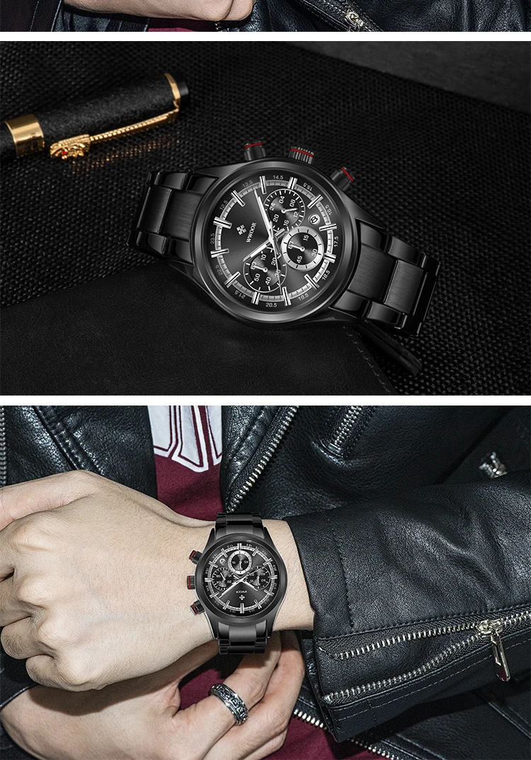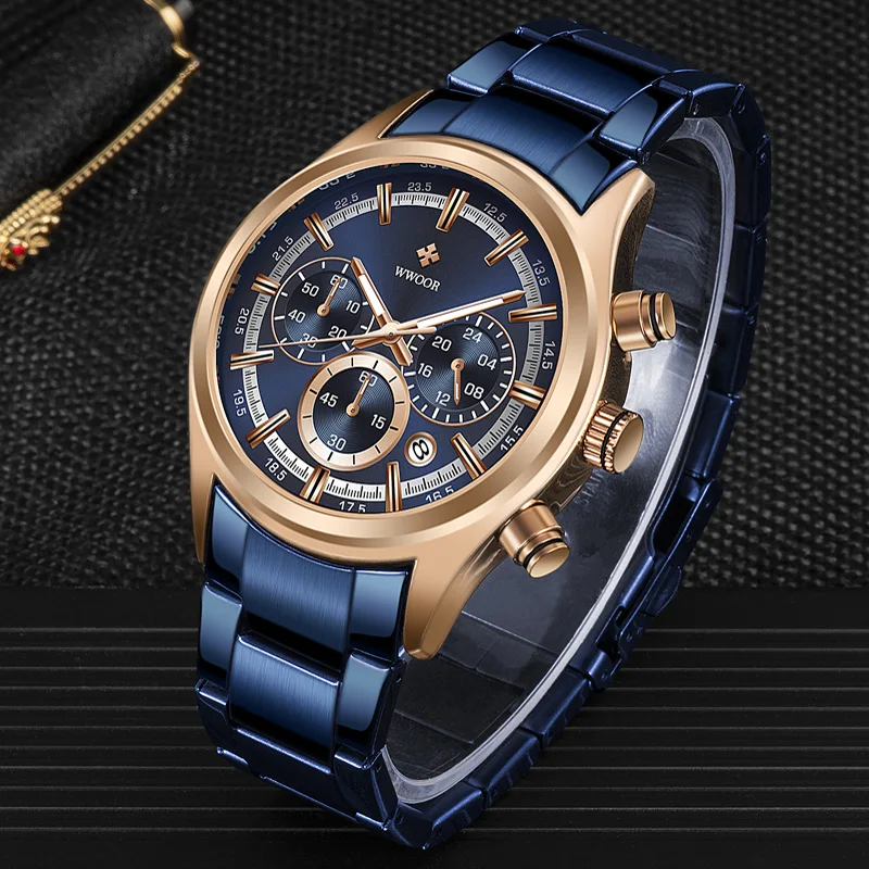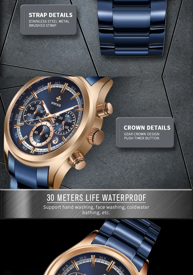 Часы наручные WWOOR Мужские кварцевые, брендовые Роскошные спортивные полностью стальные водонепроницаемые с хронографом