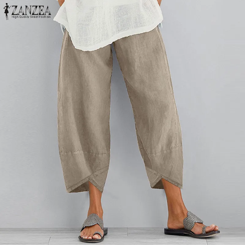 Эластичные льняные Женские винтажные хлопковые свободные брюки ZANZEA, женские Асимметричные брюки, брюки с широкой талией, повседневные женские брюки с карманами