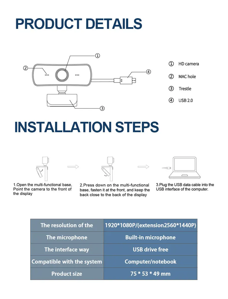 ПараметрОбъектив: HD объективТип датчика: CMOSФормат видео: AVIЧастота кадров: 30 кадров в секундуТип привода: свободный привод. Подключи и работайДлина usb-кабеля: 120 смФормат фото: BMP JPGРазрешение: 1920*1080 PФормат вывода: M-JPEGТип интерфейса: USB2.0Управление миганием: 50 ГцМикрофон: Встроенный микрофонДиапазон фокусировки: 20 ммРазмер изделия: 70 мм * 50,7 мм * 44 ммВспомогательное оборудование: Поддержка основных компьютеров, таких как Windows 2000, XP, Vista, Win7, Win8, Win10, Mac OS, Linux и других операционных системВес нетто 62,8 гПосылка в том числе1 * Веб-камера (поставляется в оригинальной коробке)1 * Руководство пользователя
