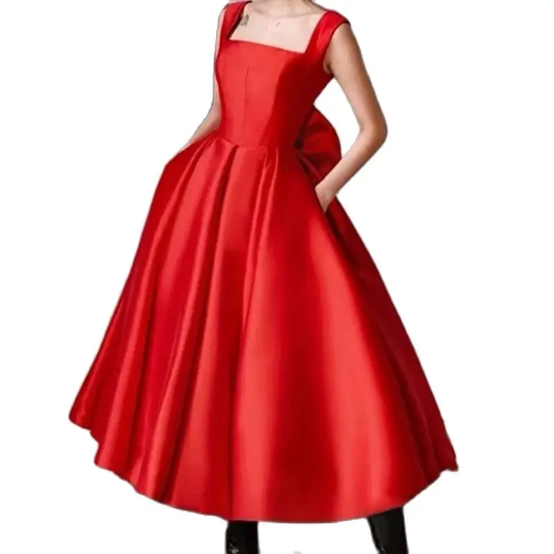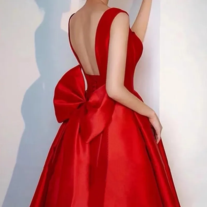 Элегантное Атласное красное вечернее платье-трапеция с квадратным вырезом 2022, вечернее платье с бантом и открытой спиной, вечерние наряды без рукавов, бальное платье для вечеринки