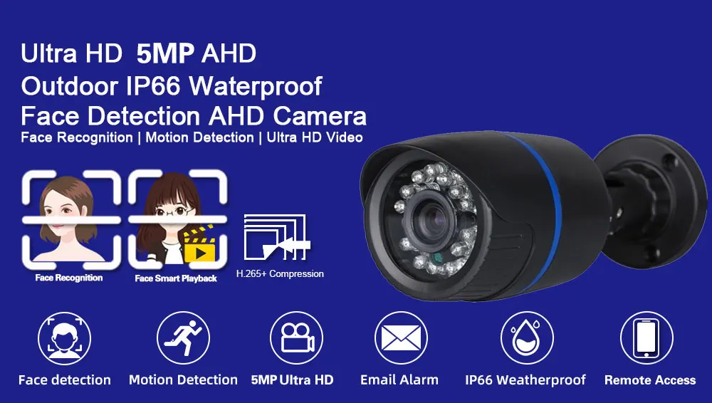 1, Ультра HD 5 Мп дисплей высокой четкости;2. Ультра HD 5MP AHD камера, АБС-пластик, IP66 водонепроницаемый, подходит для внутреннего и наружного использования; Пыленепроницаемая, надежная Домашняя безопасность;3. Улучшенное H.265 Сжатие видео, подключи и работай, простота установки;4. Поддержка распознавания лица, записи лица, воспроизведения лица, обеспечивает ультра высокое разрешение видео наблюдения, обеспечивая максимальную детализацию и четкость доступны;5. Поддержка IR-CUT переключателя двойного фильтра, днем и ночью для достижения мониторинга, цвет не является частичным искажением цвета;6. Поддержка расстояния передачи составляет 500 метров, Ультра HD дневное ночное видение;7. Поддержка обнаружения движения, оповещения по электронной почте, воспроизведение видео8. Поддержка Android,Iphone,Ipad, ПК, P2P просмотра;9, удаленный доступ в любом месте, в любое время;