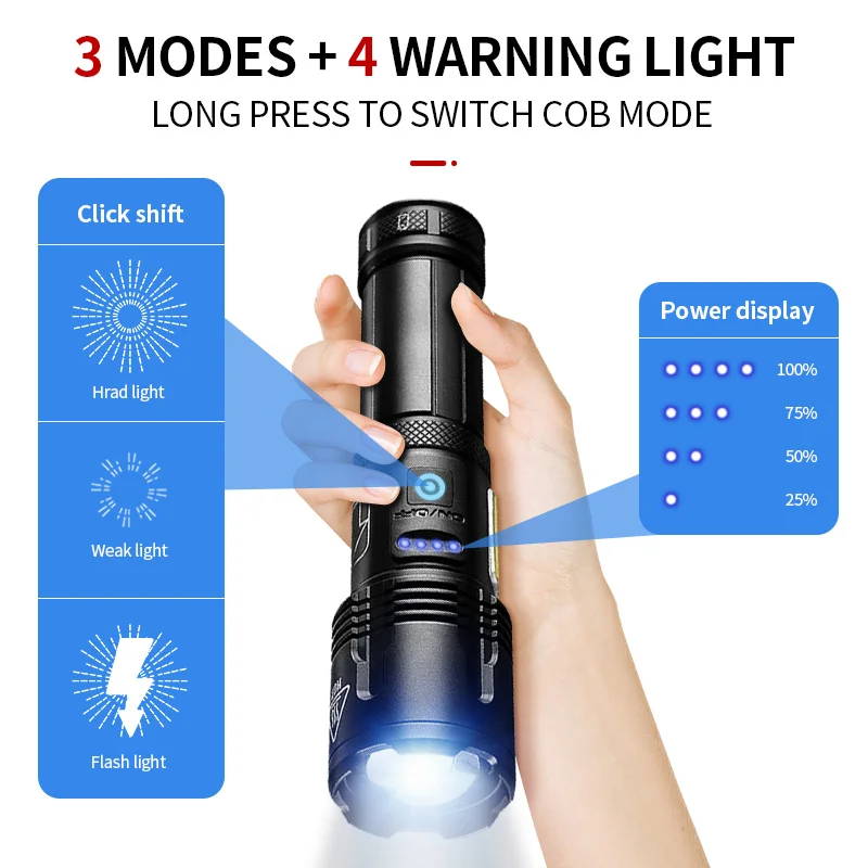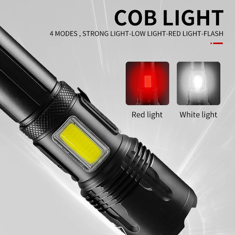 Модель светодиодный бусины: XHP160 + COBДиапазон: 500-2000 метровРежим переключения: 3 режима XHP160 светодиодный (высокий-низкий-SOS ) + 4 режима COB (белый светильник 100%-белый светильник 50%-красный светильник 100%-красный светильник SOS)COB: дважды нажмите кнопку питания, чтобы включить режим COB.Двойной щелчок для открытия режима COB: белый светильник 100%-белый светильник 50%-красный светильник 100%-красный светильник SOSУровень водонепроницаемости: IPX-6Режим масштабирования: телескопический зумВремя освещения: 1*18650 батарея 8 часов; 1*26650 батарея: 18 часовРазмер (см): 17,4*4,3*3,5 смСпособ зарядки: USB зарядка (вход и выход, с функцией мобильного питания, можно заряжать мобильные телефоны)Подходит для ночного кемпинга, рыбалки, работы, охоты, пеших прогулок, катания, приключений и т. д.