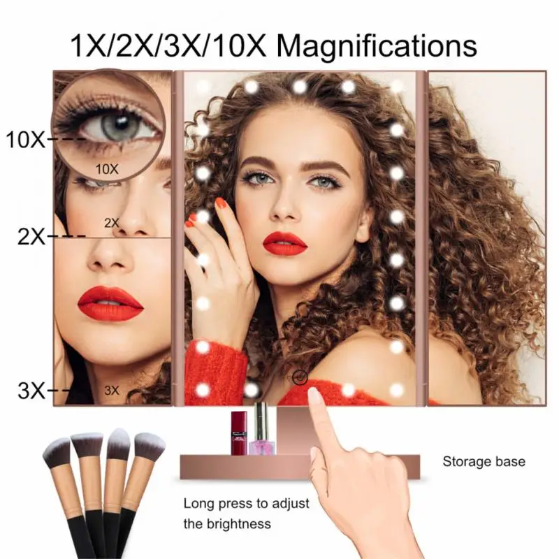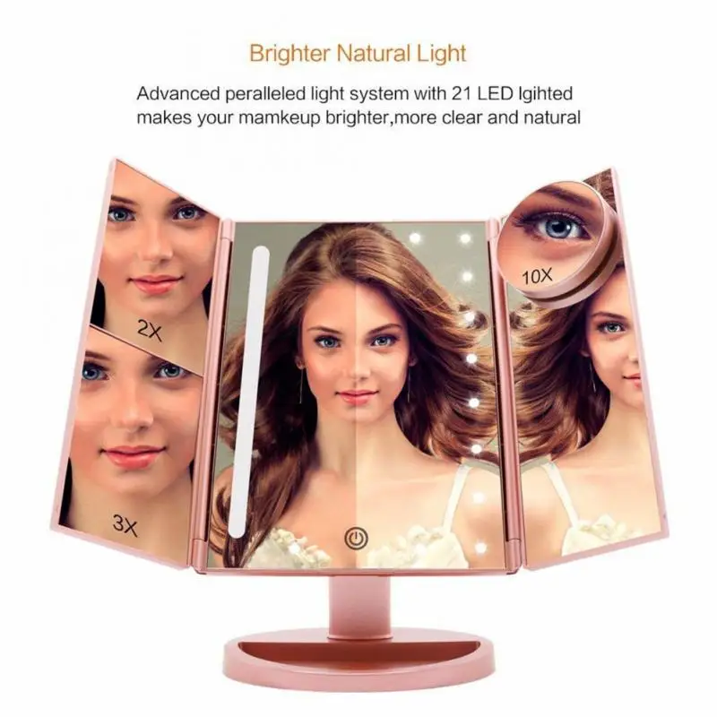 Цвет светящегося зеркала для макияжа-белый, один из самых популярных цветов для женщин. Трехстворчатое светящееся зеркало для макияжа с одним из самых ярких освещенных зеркал с 21 светодиодный лампой, трехстворчатое зеркало для макияжа имеет регулируемую яркость, которая может использоваться для удовлетворения ваших потребностей в освещении. Удерживайте сенсорный экран, 3s может сделать свет тусклым или ярким. Зеркало для макияжа можно поворачивать, которое можно держать под нужным вам углом.