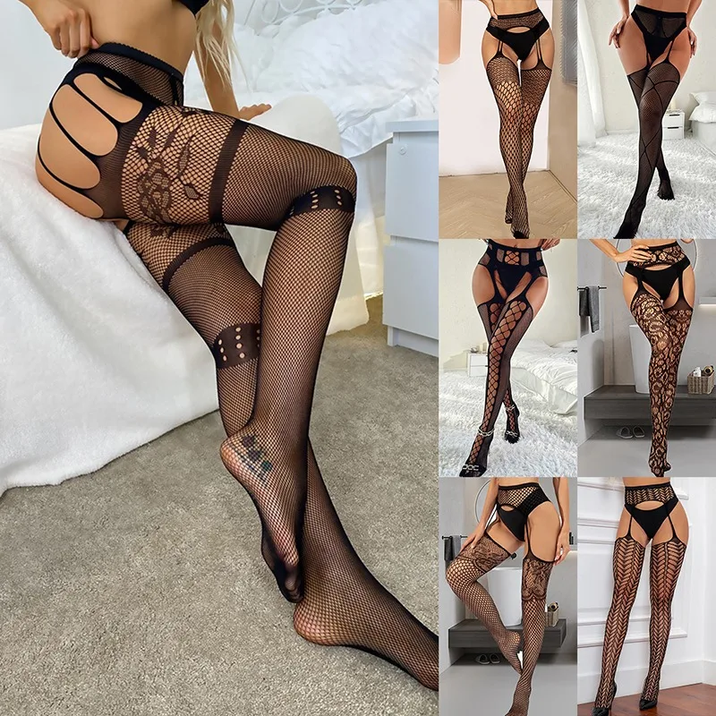 Соблазнительные чулки в сеточку с поясом, комплект для женщин, однотонные длинные носки до бедра размера плюс
