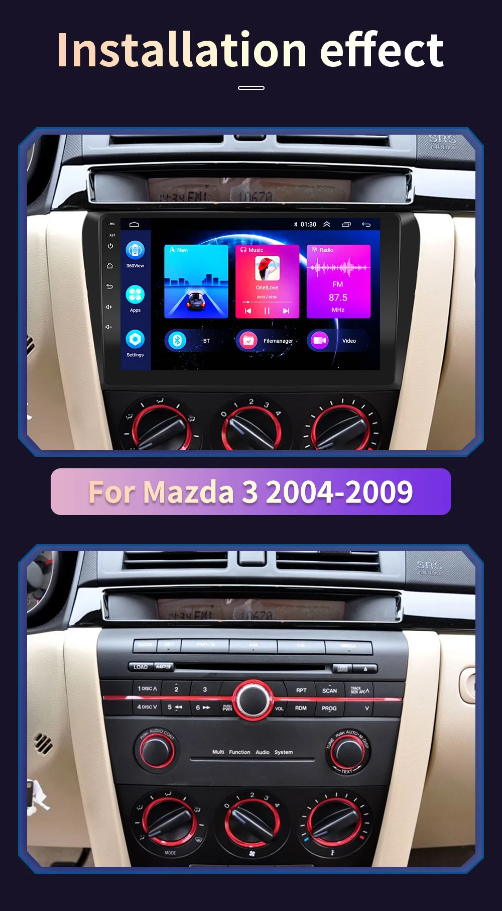 Для Mazda 3 2004 2005 2006 2007 2008 2009Для Mazda 3 2010 2011 2012 20131. Операционная система Android может установить приложение Google Play store Skype Facebook youTube Twitter и т. Д.2, 4-х ядерный конфигурация включает в себя (Оперативная память + Встроенная память): 1 Гб + 16 ГБ/2 ГБ + 16 ГБ/2G + 32G [дополнительно]3, 8-ядерный конфигурация включает в себя (Оперативная память + Встроенная память): 7216-1 г + 32 г/7216-2 г + 32 г/7216-4 г + 64 г/7216-6 г + 128 г/7216-8G-128G/ 4G-SIM-5716-2G + 32 г/4G-SIM-5716-4G + 64G/4G-SIM-5716-6G + 128G/4G-SIM-5716-8G + 128G [опционально]4, 4-ядерный содержит: версия: Android 8,1Разрешение: HD 2.5D,1024*600; Не поддерживает функцию AM и RDS;5, 8-ядерный содержит: версия: Android 10;Разрешение: HD 2.5D,1280*7207216-WIFI версия: Поддержка DSP, FM, RDS ,16EQ, HIFI, сплит-экран, двойная запись спереди и сзади и 360 панорамных функций камеры; Не поддерживает видеовыход;Ядер заключаются в следующем: 4-х ядерный Процессор и 4-х ядерный графический процессор4G-SIM-5716-WIFI версия: 8-ядерный, поддерживает DSP, FM, RDS, Hi-Fi, Разделение экран, спереди и сзади двойная запись и 360 панорамная камера функции; Не поддерживает видео выход;6. Поддержка: радиостанция, Bluetooth Вызов, Bluetooth музыка, управление рулевым колесом, встроенный WiFi, MP3, видео музыка (MPG, AVI), навигация, видеовыход, зеркальная связь, USB 4G LTE WIFI ключ и другие функции; Поддержка выбора логотипа автомобиля; Sfactory пароль: 8888